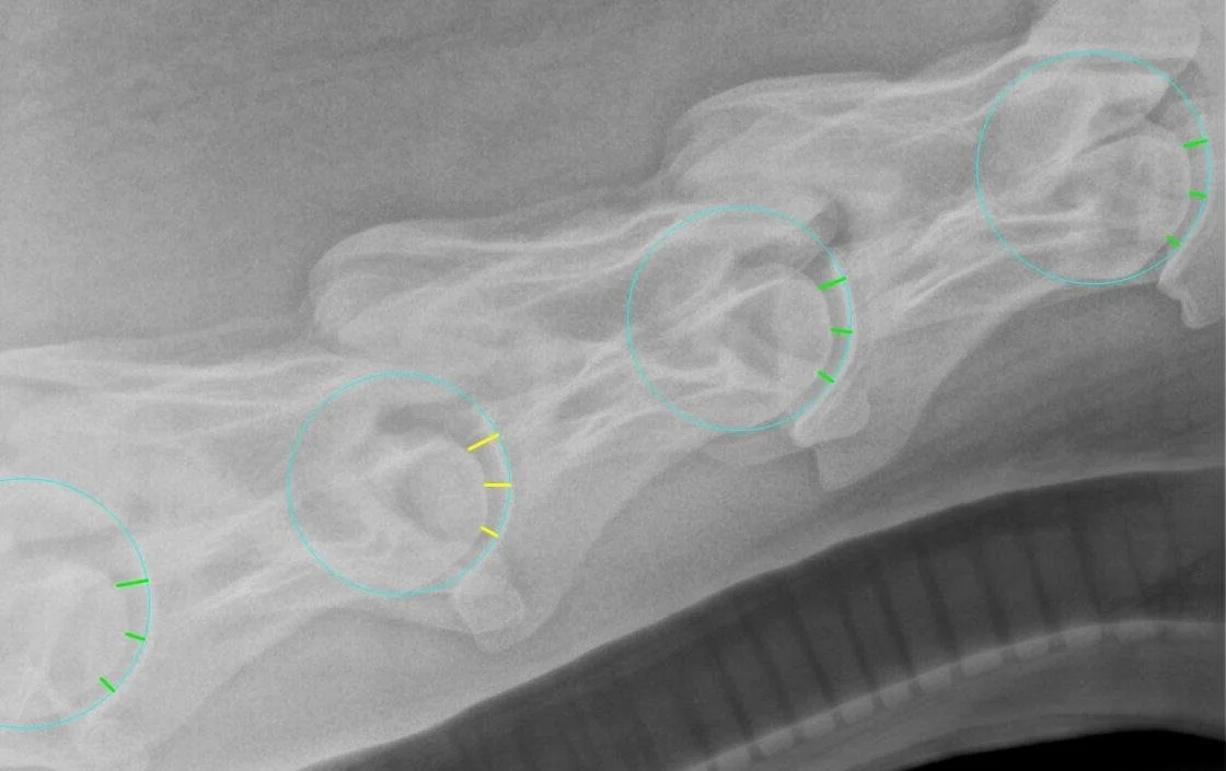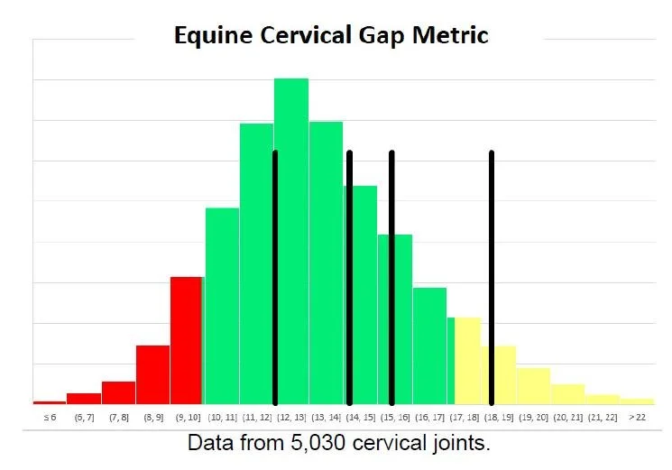 Our “Equine Cervical Gap Metric” is loosely based (or inspired by) the publication with clickable link in our report, namely, Veraa et al. But we compute the measure a bit differently. We fit a circle to the proximal joint surface of each visible vertebral body and measure the length of the joint space along 3 radial lines from the center of the fit circle. We then express the size of the joint space (or “gap”) as the ratio of this gap length over the radius of the circle, formulated as a percentage.