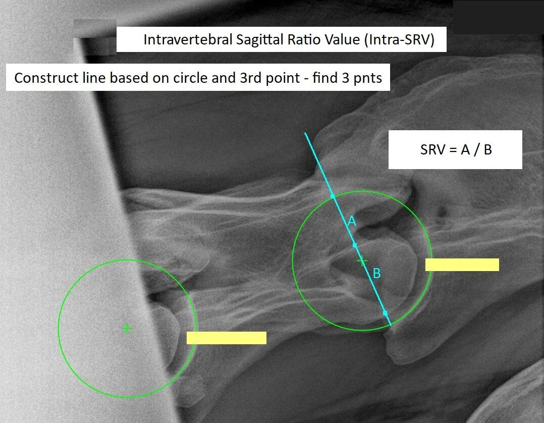 We are in the process of automating additional measures of the equine neck. The image below shows our next target: automatic calculation of the intervertebral sagittal ratio value (Intra-SRV) as discussed in the reference Rush et al. Our computation of this value will proceed as indicated in the image below: