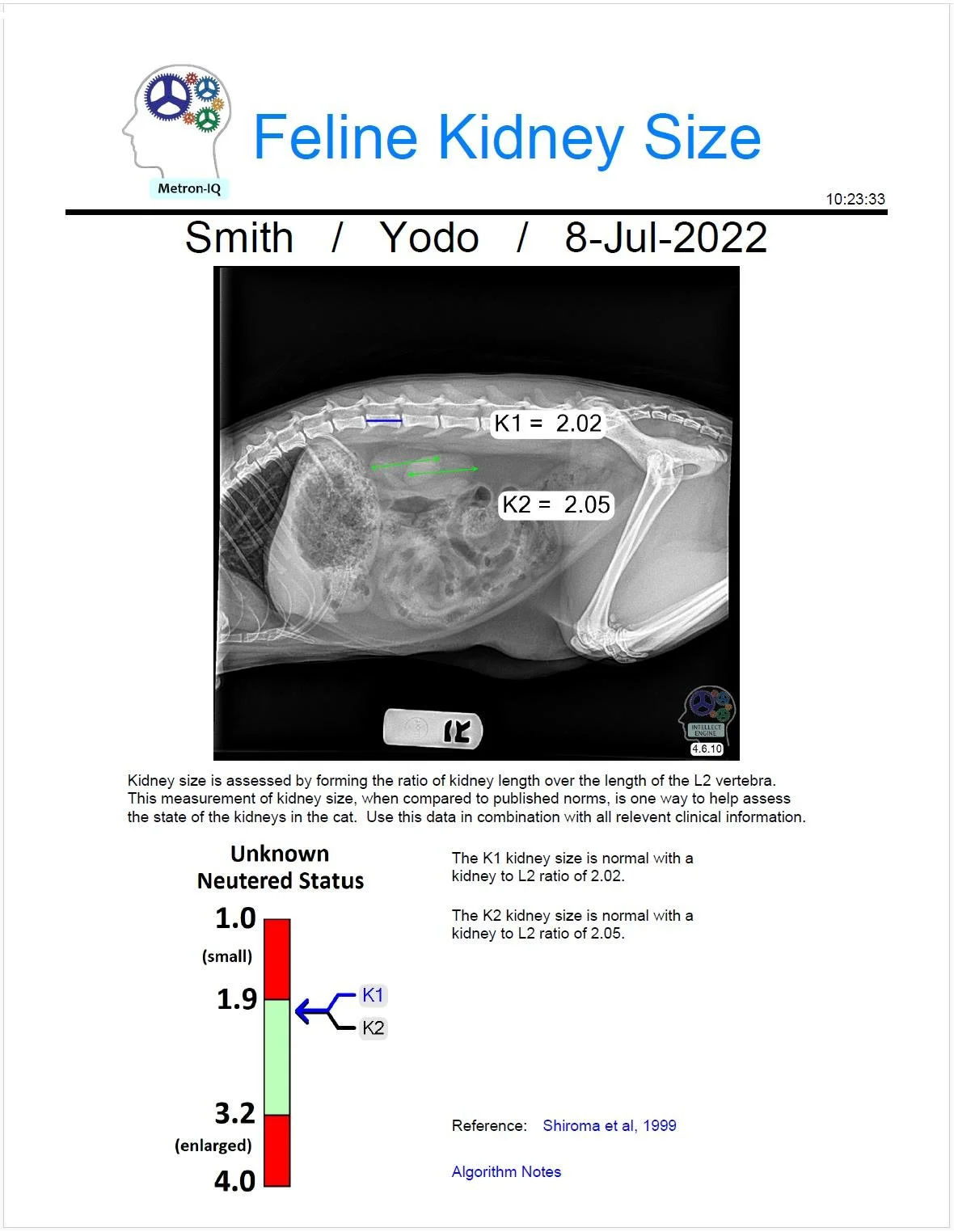 Automatically measures the size of the kidneys in a VD Abdomen radiograph.